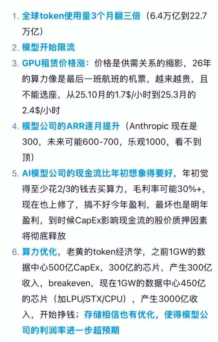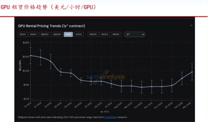 存量芯片(H100/A100):半年内租金上涨40%,长协价升至2.35美元/小时。训练端刚性需求叠加推理端爆发,老芯片“降级”至推理场景,进一步挤压供给弹性。