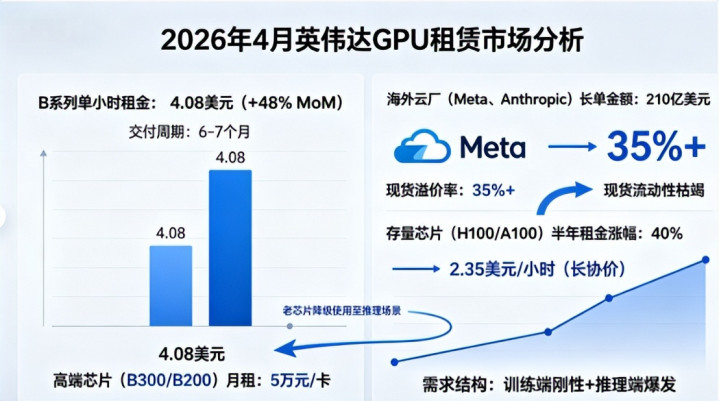 高端芯片(B300/B200):月租突破5万元/卡,交付周期拉长至6-7个月。海外云厂(Meta、Anthropic等)以超210亿美元长单锁定CoreWeave等算力方产能,现货流动性枯竭,溢价率飙升至35%+。