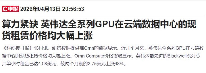 Ornn Compute价格指数显示,英伟达最先进的Blackwell系列芯片单小时租金已达4.08美元,较两个月前的2.75美元上涨48%。