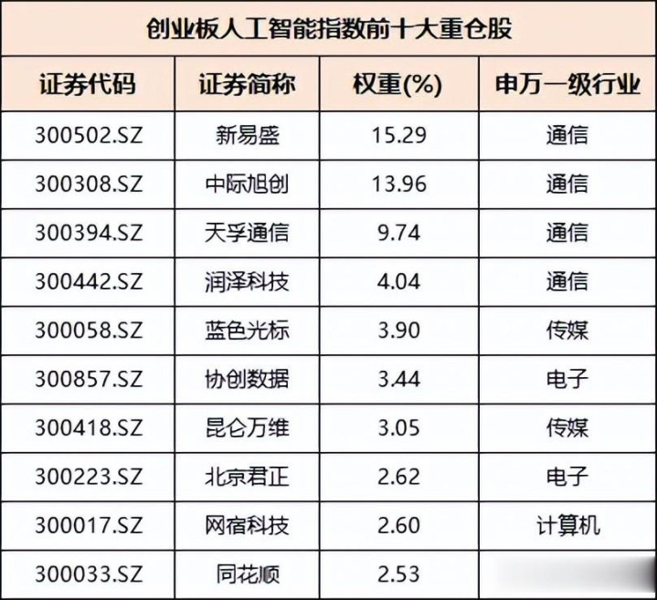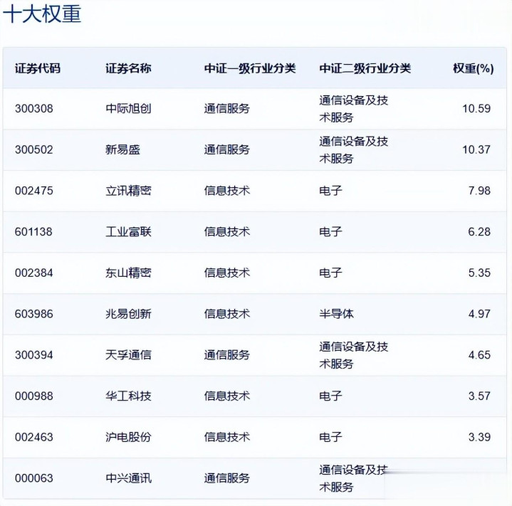 前十大权重股分别为中际旭创、新易盛、立讯精密、工业富联、东山精密、兆易创新、天孚通信、华工科技、沪电股份、中兴通讯,前十大权重股合计占比60.43%。
