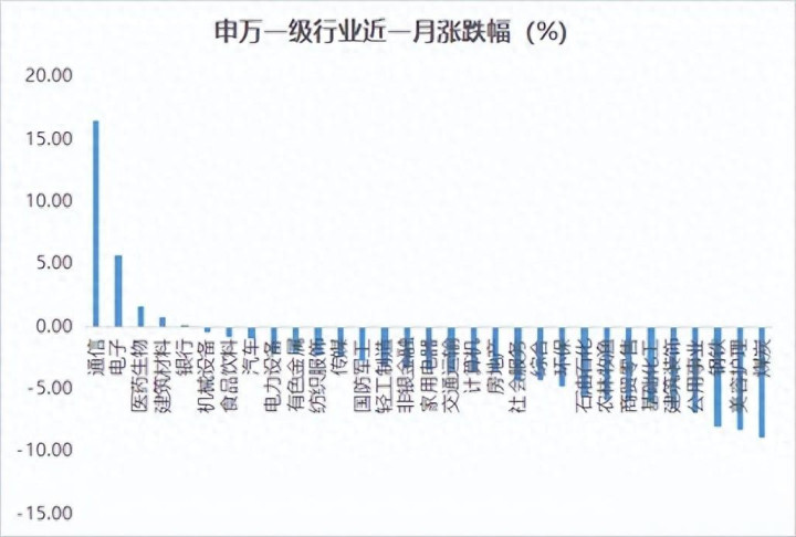 随着国外冲突事件放缓,市场开始修复,资金从防御型资产加速向成长板块切换,通信、电子、新能源等科技成长板块成为绝对领涨力量,尤其是通信行业近一周涨幅12.31%,近一月更是以16.45%的涨幅领涨申万一级行业。