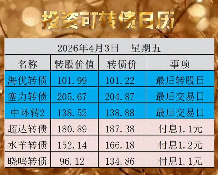 3日为塞力转债、中环转2最后交易日,如果投资者忘记操作,还可以在9日最后转股日之前转股卖出。